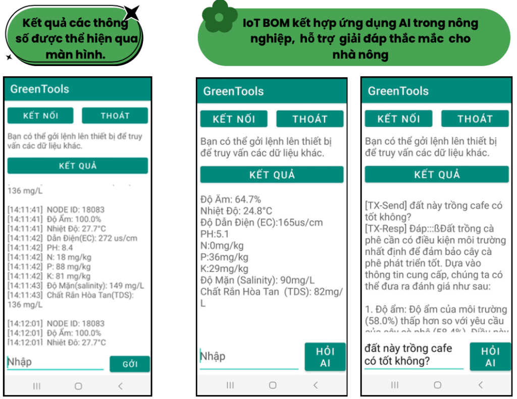 Người dùng có thể hỏi trực tiếp AI Greentools về kết quả đo, ví dụ: “Đất hiện tại có phù hợp trồng chuối không?” và nhận ngay tư vấn dựa trên dữ liệu đo lường thực tế.